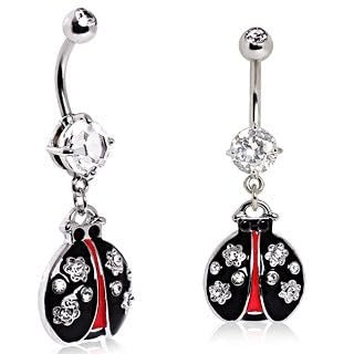 316L Surgical Steel Lady Bug Navel Ring. Fancy Prong Set Navel Ring with a Lady Bug dangle. Lady Bug has Red body, Black wings, and Clear CZs on wings. Thickness : 14GA / 1.6mm Length : 3/8" / 10mmLength: 3/8" / 10mm